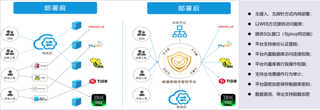 完善安全体系建设,事前预防操作环节数据安全隐患发生。运用完善高效的数据库权限管控机制,降低DBA管理的安全压力,有效减少监管盲区。依靠强大的管控功能,提升开发测试、运维管理等业务环节的工作效能。依靠强大的管控功能,提升开发测试、运维管理等业务环节的工作效能。